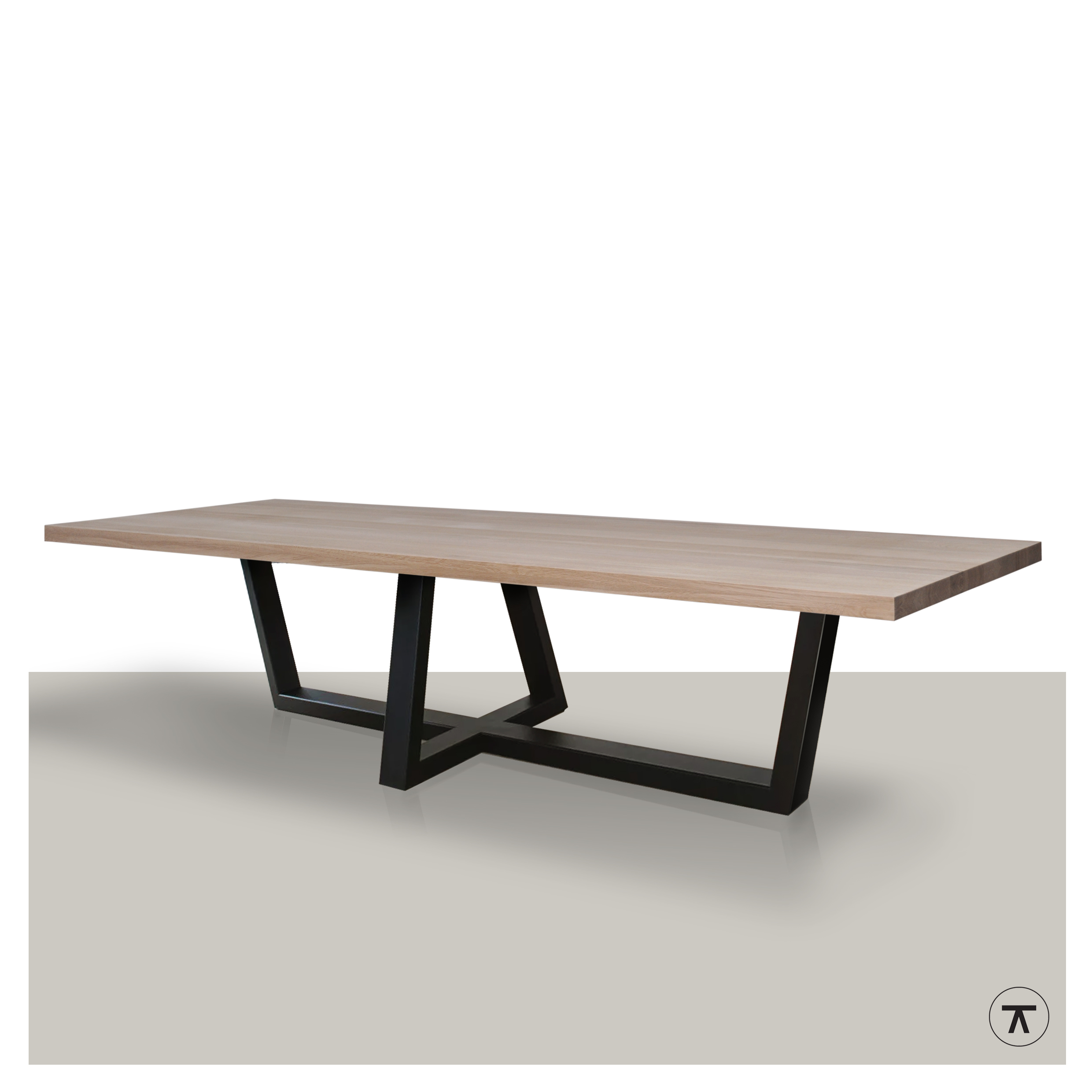 Het massief eiken tafelblad van deze rechthoekige tafel Cross Road is 3, 4 of 5 cm dik en wordt afgewerkt in de gewenst kleur.