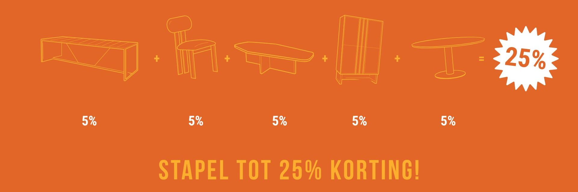 - 5% per categorie (Categorieën: tafels, salontafels, stoelen (ook krukken en eetkamerbanken), tuinmeubelen, kasten)
